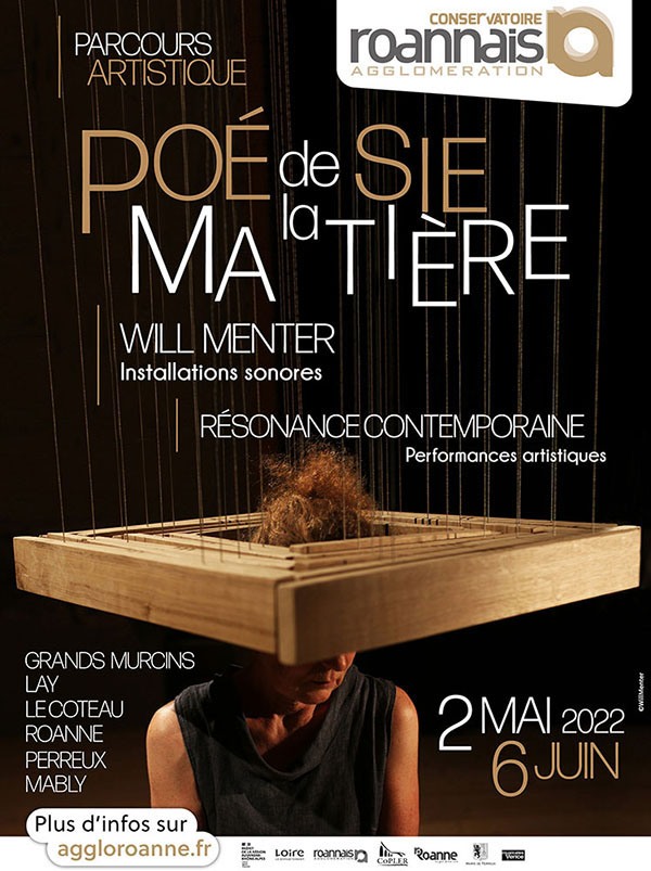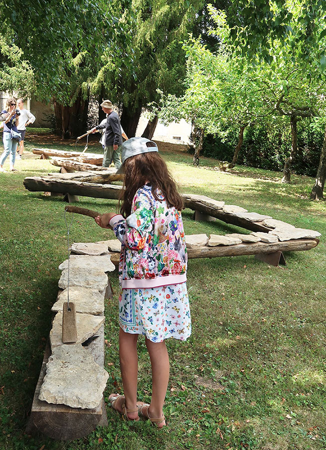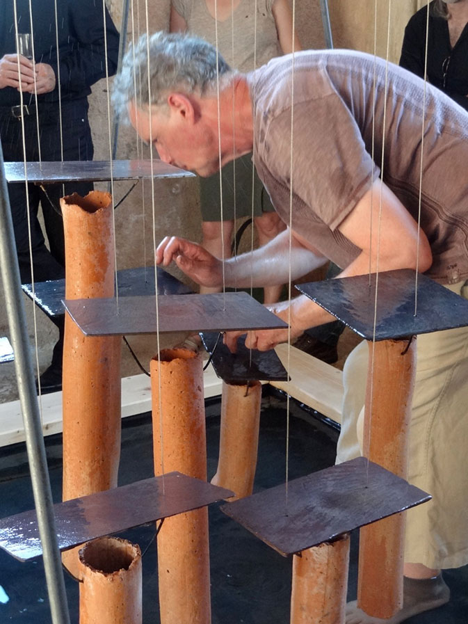 et plusieurs sculptures sonores en bois, pierre, eau, terre, aluminium