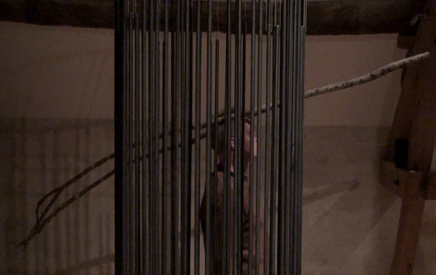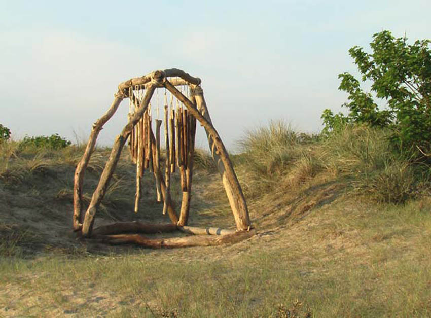 Most recently, in fact only a week ago as I write this, I performed a new solo piece called Dark and Light Matter. I based it around three of my sound sculptures. My aim then was to let the sculptures be themselves and also to relate to them closely with my whole body, not just my wind and fingers. So I walk very close to Air Sur Terre letting my shoulder just brush against it. I push my way into Standing Steel, enjoying the clatter of the steel bars and then letting the sound subside into a gentle murmur that sounds like voices echoing in a long tunnel, and lasts much longer than I expect. The bars themselves are solid, not hollow, but I imagine the vibrations inside them rushing back and forth from one end to the other, not able to escape and only gradually able to transfer their vibrations to the air. Then